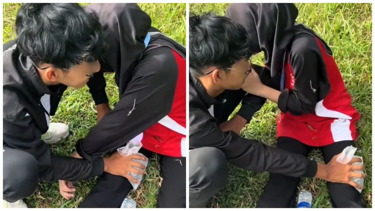 In the clip taken from TikTok, a boy in school sports gear can be seen applying ice pack to a girl’s thighs as she cries to what some see as a “sweet” moment.